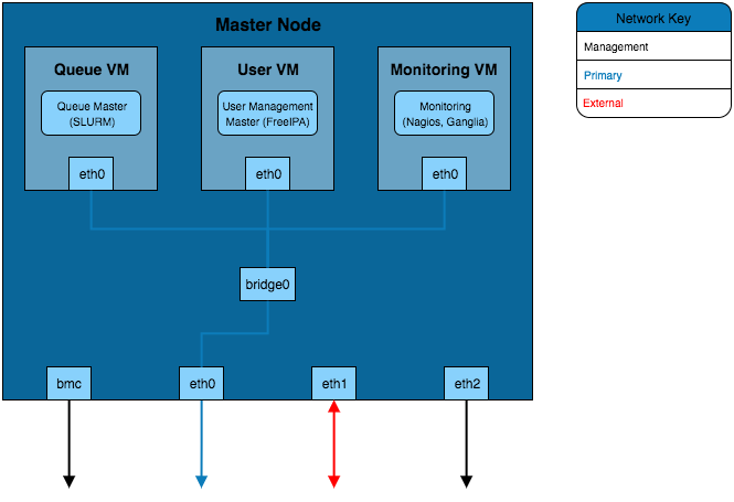 This solution separates the services into VMs running on the master node. In order for these VMs to be able to connect to the primary network a network bridge is created that allows the VM interfaces to send traffic over the eth0 interface.