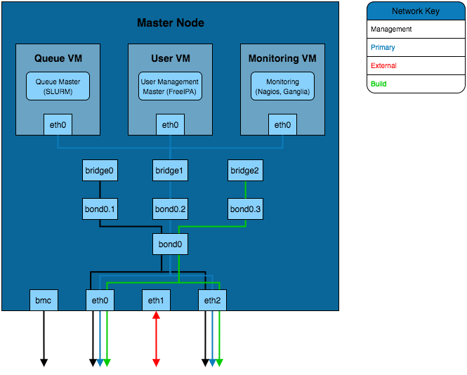 The above solution implements the channel bonded infrastructure in a network with VLANs. The VLANs have bond and bridge interfaces created for them. This allows some additional flexibility for VM bridging as virtual interfaces can be bridged onto specific VLANs whilst maintaining the redundancy provided by the bond. This adds additional security to the network as the master node can be left without an IP on certain VLAN bond interfaces which prevents that network from accessing the master node whilst VMs on the master node are able to reach that VLAN.